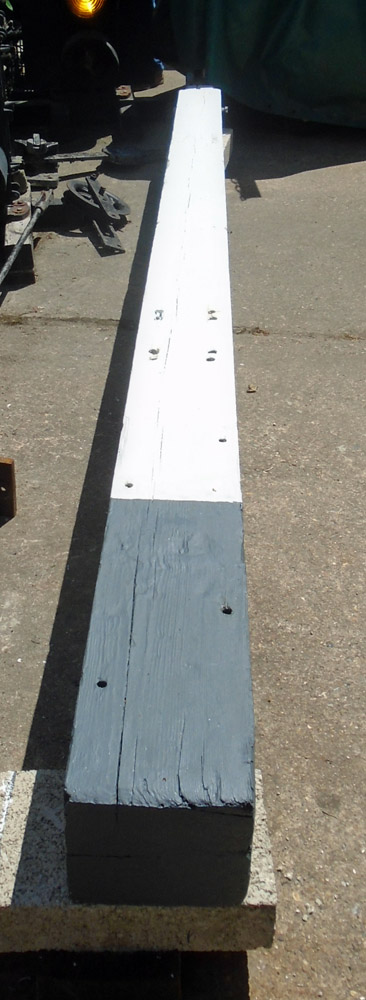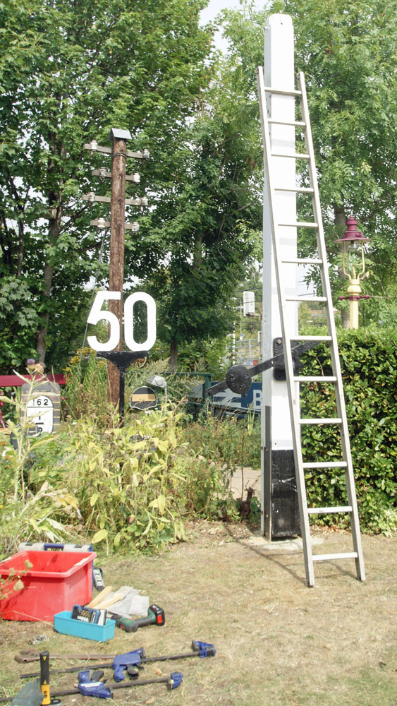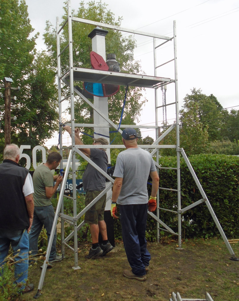 The information boards on photo 2 were designed by Les and describe the restoration and workings of the box. A duplicate set is on display at the box. In photo 3 Les is helping Keith Webster move a Midland Railway lamp-post out of store to be taken to the box and in photo 4 is the path accessing the box in which Les took a lead in getting the paving slabs laid.